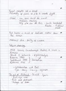 For the next few weeks we have 3 lectures on film theory, each looking at a specific area within that. This week the lecture was on The Auteur and was focusing mainly on Alfred Hitchcock. An auteur is normally a director whose movies are characterised by a filmmaker's creative influence. They are similar to artists in the way that they produce original work and have their own creative control. In the 'Auteur Theory' by Sarris (1962), he explained that they should all have a technical competence and that the director's distinguishable personality should be able to come through within the movie. The technical competence of the director in Hitchcock's case was that he was able to tell his story visually in the silent era; he used montage and cutting to create tension within his films; the use of subjective camera - the point of view of the character in the film. All their films should have an interior meaning - a deeper meaning than what is just seen on the surface.