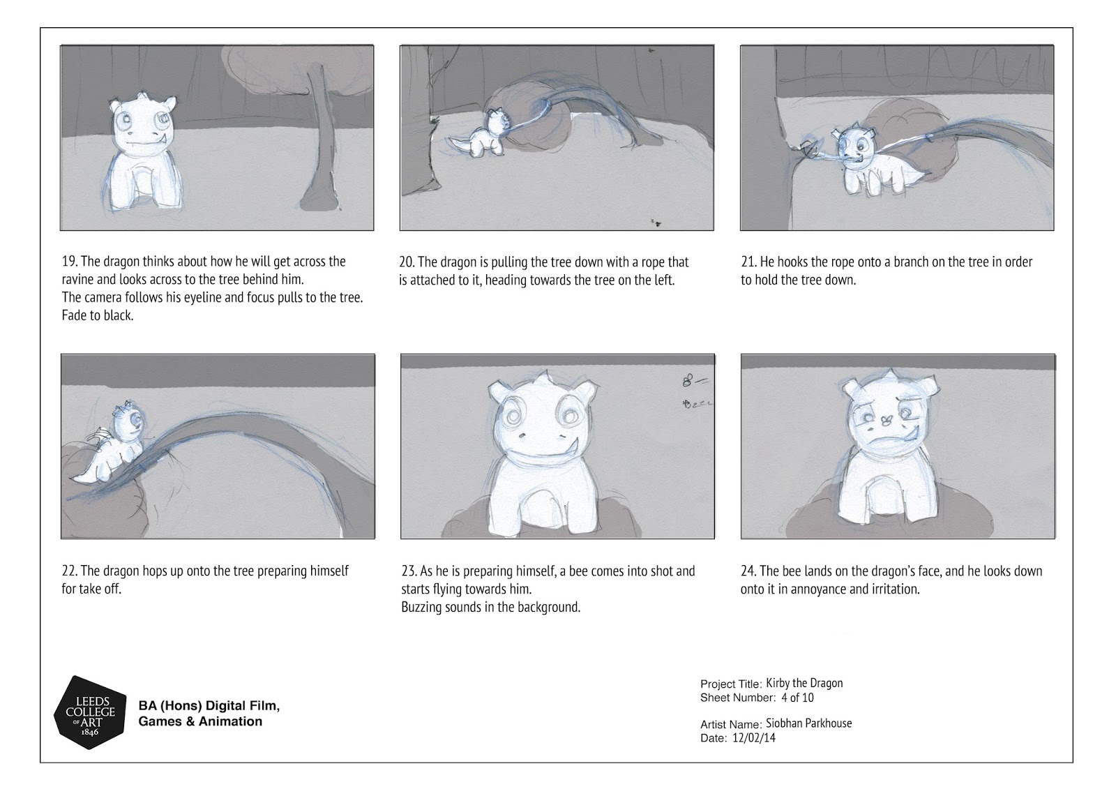Below are my storyboards for my animation along with the animatic. I've tried to time out the animatic as best as I can and hopefully this will be used to aid a possible music composer. At the minute the animation will probably reach around the 2 minute mark (I always find my animation is longer than I originally anticipated from the animatics). For the storyboards I have taken my original story ideas and expanded them further, adding in more detail to each specific shot. As you can see, you can get an idea of how each shot will be laid out, however I haven't put specific camera shots in. I find that I work much better in a 3D space when it comes to layout and composition, so I will be doing this in more detail within Maya once every asset is created. I've tried to describe the key emotions that the dragon will be feeling as to give me a guide when it comes to animating. I will be referring back to my storyboards when I reach the animation stage, staying close to the original concept but possibly improving the composition of the shots.